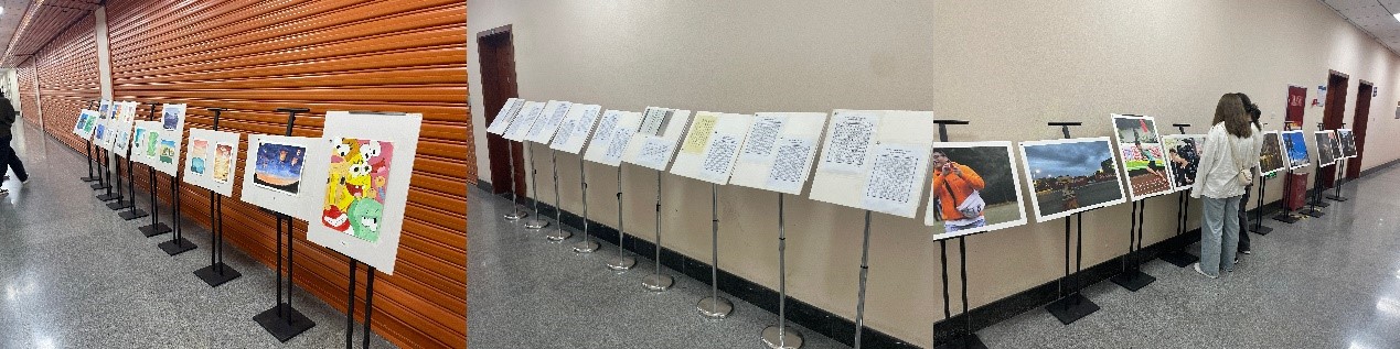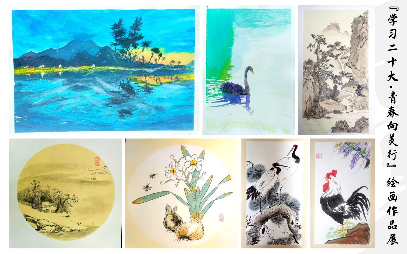 本次展览融合了多个展区,展出了包括第一届“向美而行”水彩绘画训练营营员的优秀结业作品、“学习二十大精神·书写二十大金句”活动作品、2023届毕业生校园摄影作品以及蘑菇视频