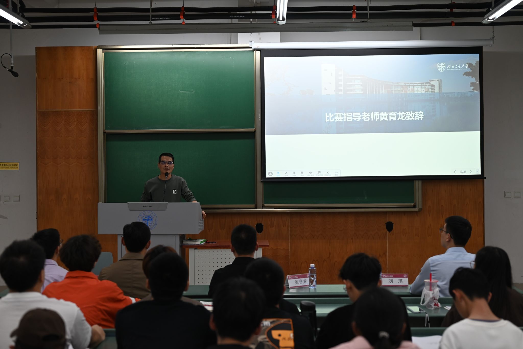 随后是由指导老师黄育龙老师为选手们致辞,黄育龙老师首先是对学院、赞助公司及同学们对本次大赛的大力支持和付出表示感谢,并鼓励到场同学们积极参赛,随后指出比赛过程中应注重扎实的基础知识、灵活的思维能力、团队合作意识。同时承诺为参赛选手提供仪器和技术上的指导和支持。最后他祝愿同学们在此次测绘技能大赛中能获益良多、取得好成绩。