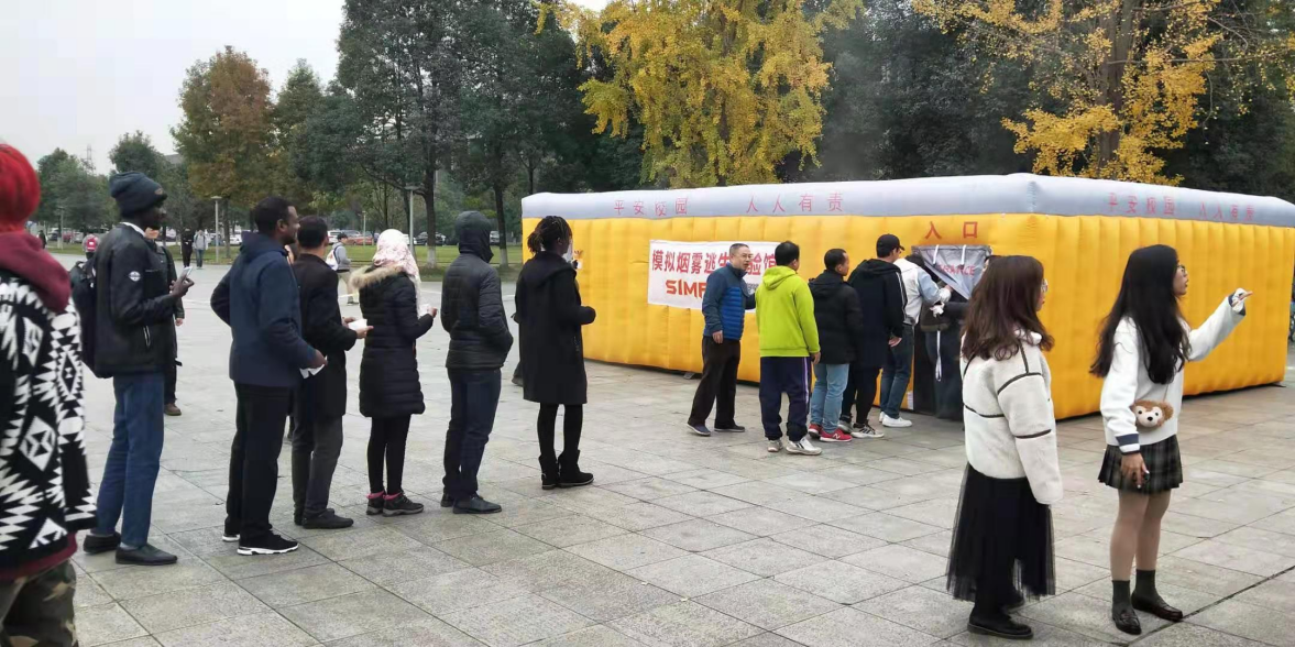 最后是体验环节,参与者及志愿者在指定区域进行模拟烟雾逃生以及模拟灭火体验