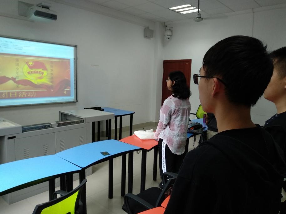 第一部分,同学们面对团徽齐唱团歌.同学们铿锵有力的歌声,坚定了我团将坚决拥护党的领导并积极有活力的帮助党的工作任务.第二部分,我们观看了“我们走在大路上--新中国的崛起”.从中,同学再次认识到了新中国如何成立,如何发展.感受到前辈们在艰苦岁月人砥砺前行,不少同学潸然泪下.第三部分,我们进行了问答环节.同学们从中了解到了我党的一些规章制度,一致认同这是个很好学习党章的方法.我们也同时进行了一些有趣的问题,加强了同学们之间的认识,展现了同学们知识方面的才华.总的来说,本次活动十分圆满.