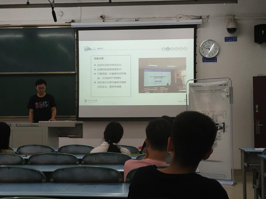 科创部部长黄贤喆为同学们就科创竞赛活动对大家进行了培训。黄部长主要从科创竞赛、SRTP项目、科创的必要性、经验与建议四个角度进行讲解。首先他提到了各项热门比赛,做比赛不仅仅能够获得保研加分,更能够起到锻炼自己,提升自己,促进与人合作的作用。接着,他为我们介绍了一下SRTP相关事项以及如何做才能完成一个比较好的项目。文体委员在科创活动进行之中起着非常大的作用。文体委员需要搜集相关信息,编写科创通告来动员大家投入科创竞赛活动。此外,文体委员个人的影响也非常重要,要身体力行,带动更多同学的参与。另外,文体委员还需要具有先机,更早更全面地了解科创比赛的安排,做到更详细的规划。最后,黄部长又给宣传文体委员提了几点要求,要求他们经常关注校网和学院网,并及时把信息传递给全班同学。
