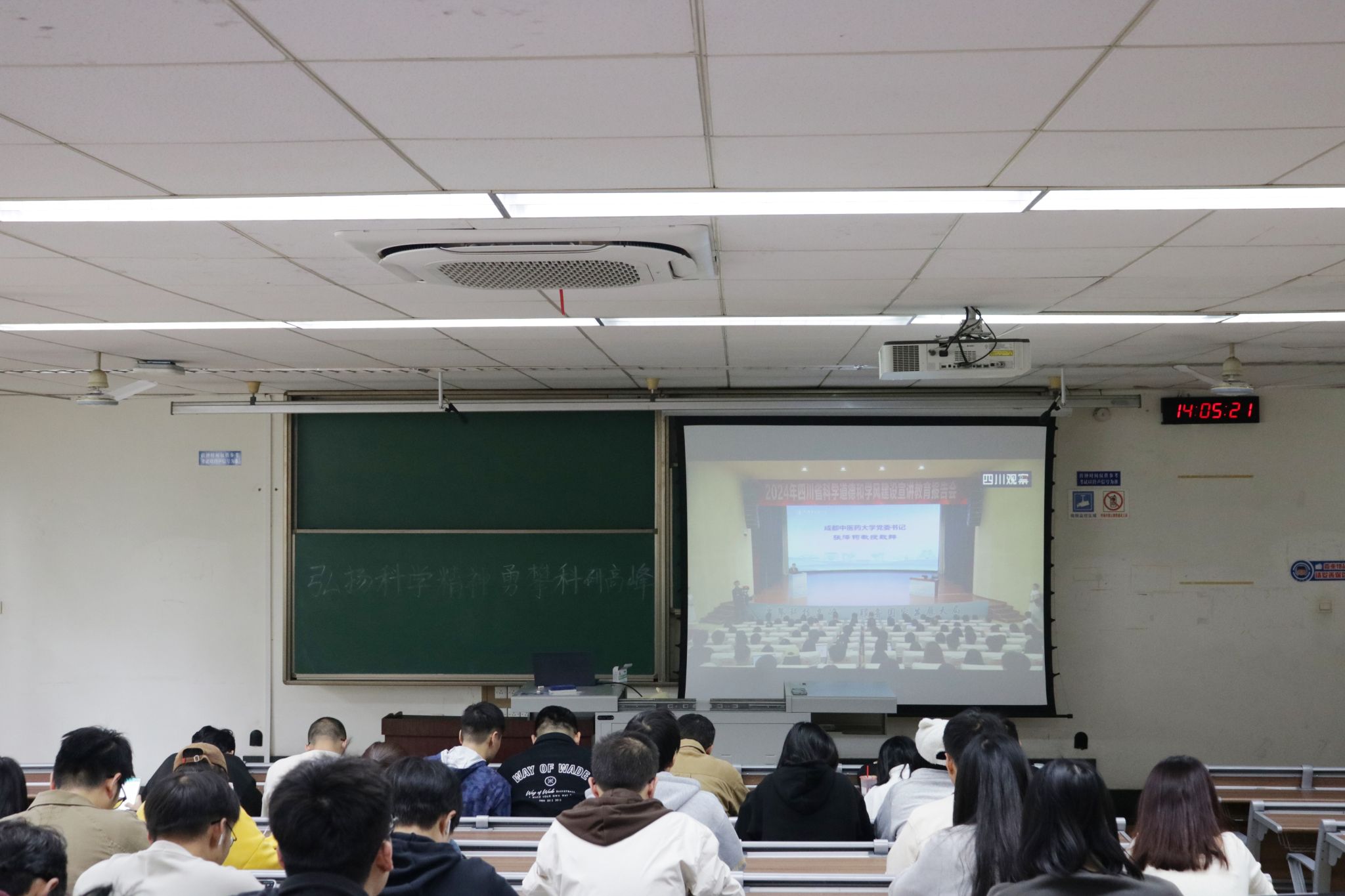 在九里校区4309教室组织2024级研究生观看四川省科学道德和学风建设宣讲教育报告会网络直播。报告会以“弘扬科学家精神,涵养优良学风,加快实现高水平科技自立自强”为主题,中国科学院院士、四川省科协主席、四川省医学科学院·四川省人民医院院长杨正林院士以及中国工程院院士、成都中医药大学首席教授陈士林院士分别作宣讲报告。