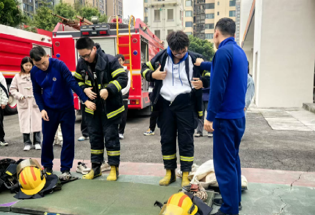 随后,同学们在战士们的指导下,亲身体验了消防战斗服。穿上厚重的消防服后,同学们感受到了消防员在执行任务时所承受的身体压力,更加深刻地体会到消防工作的艰辛和伟大。