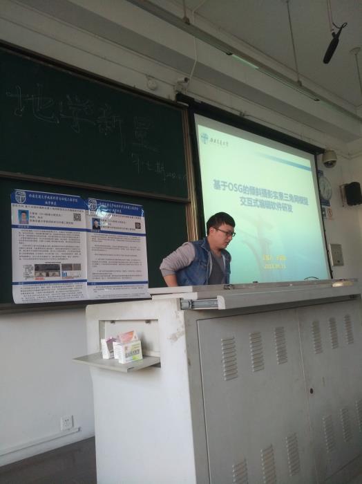 在X2424教室中,由2017级博士研究生朱庆和2016级硕士研究生于昊加进行汇报。朱庆博士给大家介绍了“面向三维城市建模的多点云数据融合方法探索”的研究进程,昊加同学则为我们讲述了“基于OSG的倾斜摄影实景三角网模型交互式编辑软件研发”
