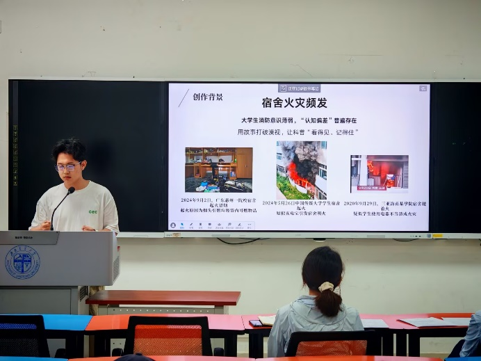 答辩现场气氛热烈而紧张,各参赛队伍依次登台展示。他们围绕消防设备优化、消防主题科幻剧本创作、安全科普宣传等多个方面展开阐述。从 “吃饭不排队” 制作的消防宣传短片,到 “炎盾护卫队” 研发的防火门出口疏散方向指南系统,选手们运用宣传海报、三维演示、场景模拟等多种方式,充分展现作品的创新性和可行性。