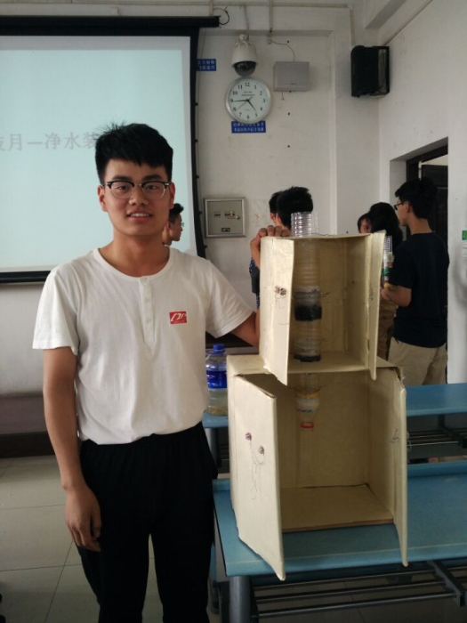 5月20日下午2:15工作人员拿检测装置所需要的电子秤、秒表以及浊度仪来到X2529,进行分工,一个人记录成绩并提醒前来参赛的选手登记,一个人记录时间,两个人操作浊度仪,其余人员负责洗刷检测所需要的装置。2:30陆陆续续有选手前来参赛,工作人员引导他们登记,比赛依照参赛选手登记的顺序进行,期间,有的选手的装置制作很成功,无论是过滤速度方面还是过滤后液体的浊度方面都近乎完美,其他选手纷纷围观,讨教经验,也有某些选手的装置稍有不足,检测完后他们互相分享经验与心得,现场气氛十分融洽。18:30比赛检测装置阶段正式结束,工作人员疏导参赛选手离开后,根据先前制定的评分细则计算所有参赛选手的总成绩,前来比赛的队伍达25组,根据成绩的高低从中得出获奖的6组同学。