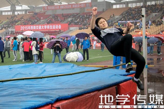 比赛刚开始,竿的高度设为1.10米,不少女生就在悄声议论,自己能不能跳得过去,但是当比赛正式开始后,谁都全力以赴,无所畏惧。首先上场的是来自峨眉校区的周思源,只见她凝神向着那根横竿跑去,加速,起跳,翻身,落下,随着一条优美的弧线,她顺利跳过,赢得了在场人的鼓掌与欢呼,首站告捷,这也给后面上场的同学做出了榜样。后来,来自交运学院的刘璐上场,她个高的优势让在场的人都觉得这高度没问题,但是,初次的起跳出了点小问题,没跳过,但是她没灰心,在第二次起跳中完美越竿。就这样,1.10米段比赛中,有四人成功晋级。