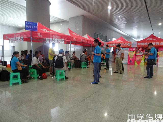 到达东客站以后,由于火车东站的特殊性和先进性,我们的迎新点布置在站内。所有的志愿者统一着蓝色服装,佩戴白色工作证,在出站口高举着印有“蘑菇视频