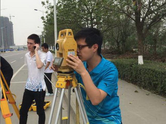 4月13日下午3时许,尽管天气异常炎热,参赛选手们却十分珍惜赛前的练手机会。犀浦校区四号教学楼背后的主干道上,随处可见正在熟悉场地以及练习仪器操作的选手。虽然测量技能大赛还未正式开始,空气之中已经弥漫着“硝烟”的味道。校道两旁,有的团队正在讨论分工合作,比如如何保持对中整平的稳定性,借此提高测量效率;有的团队为了提高熟练度,正在比赛场地进行实地测量。这足以见得,参赛选手们都十分重视此次比赛。