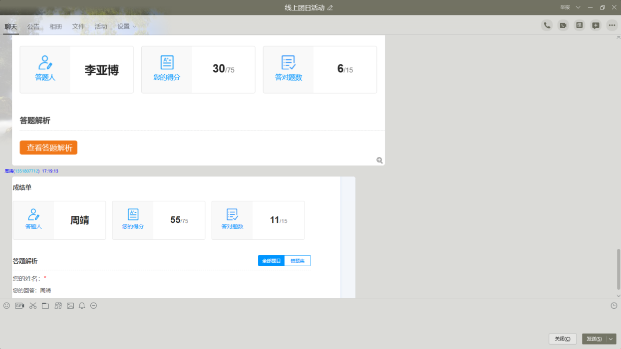 活动开始,参与团日活动的成员首先完成线上“关于新型冠状病毒的问题”答卷的测试,并将结果积极反馈。