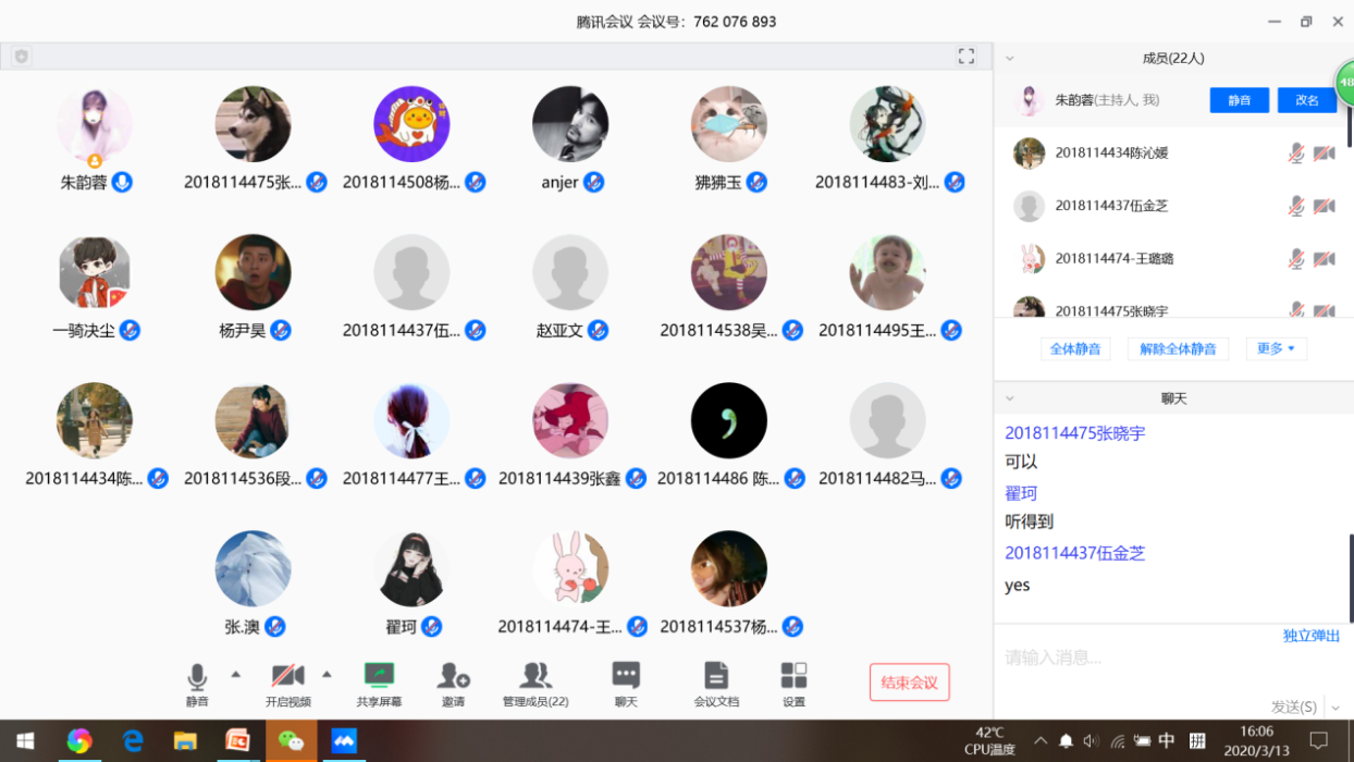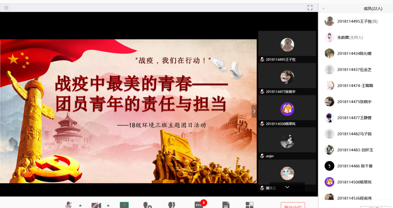 2020年3月13日,2018级环境三班召开了“战疫中最美的青春——团员青年的责任与担当”为主题的“战疫,我们在行动”线上全体会议,会议由团支部委员朱韵蓉主持。