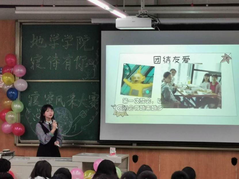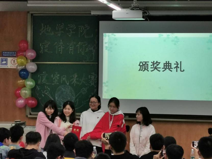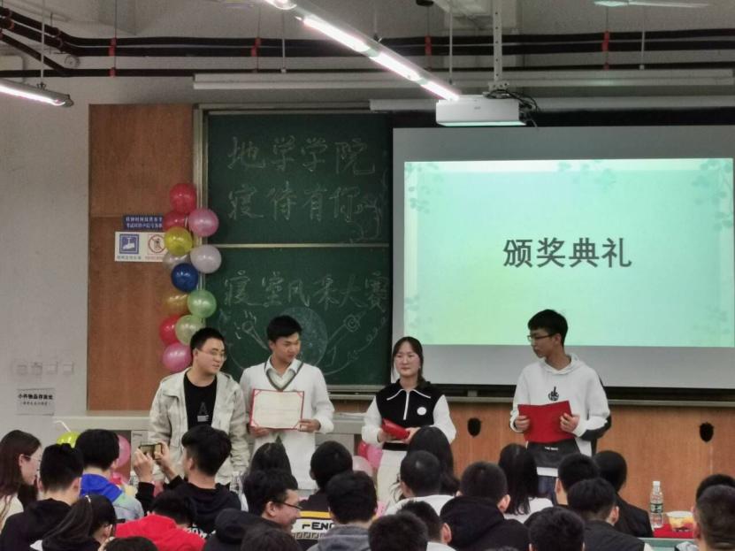 最后,12个寝室经过激烈的角逐,通过网上投票,亲友团数量加分,以及各个评委的综合打分,最终角逐出了1个一等奖,2个二等奖,3个三等奖和3个优秀奖。20级辅导员郑文娇老师,徐惟微老师,董可老师以及地学学生会主席霍东峰分别上台为他们颁奖。