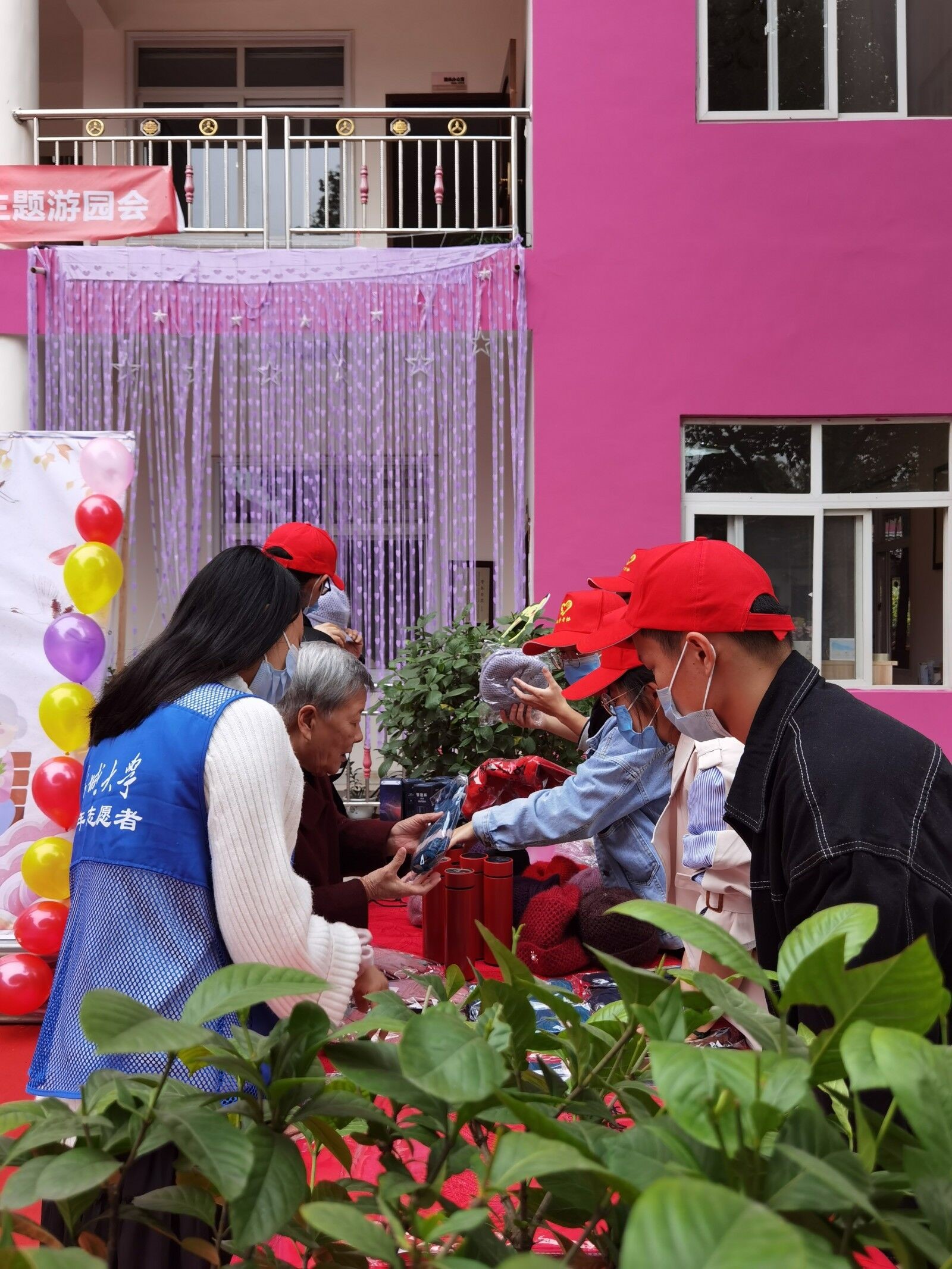 节目环节中,志愿者们为老人们表演了集体歌舞节目《重阳献歌》,在经典曲目《爱我中华》的旋律响起时,不少老人主动跟唱,给志愿者捧场。活动进入到游园会环节,现场更是热闹非凡,志愿者们在已经安排好的分工下各司其职引导老人参与猜字谜歌名、夹弹珠、垃圾分类等游戏、维护现场秩序、给老人发放游园奖品,让大部分老人都能参与,保证活动安全有序。十一点半游园会结束后,志愿者协助整理好活动现场,向社工及老人们辞行,骑自行车返回学校。