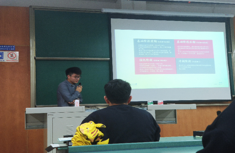 其次,由刘礼钊学长进行关于考研准备和考研学习方法的讲解,并且他提到决定考研之前,一定要想清楚自己想要什么,要怀有目的性地去进行学习和准备。他强调备考是十分枯燥的,一定要制定适合自己的学习计划,分配好每个时间段的任务并且及时完成。