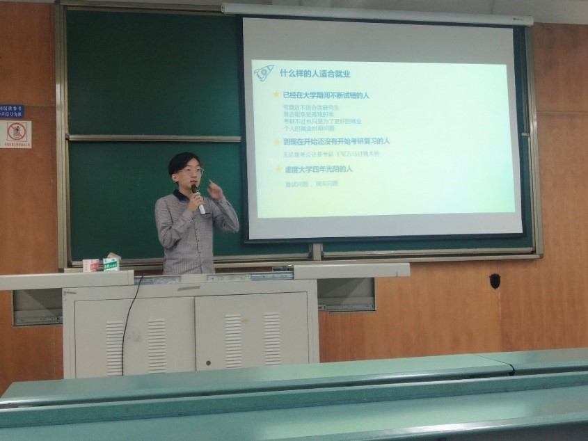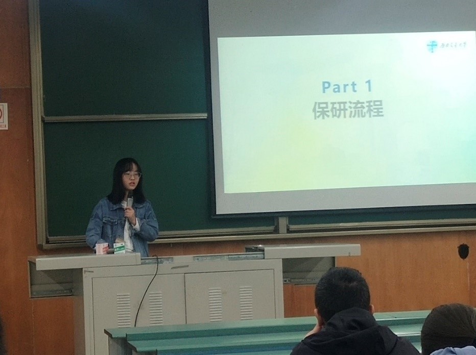 最后由赵爽同学针对保研经验进行了分享,她从保研流程、学校选择、夏令营材料和联系老师的方法四个方面进行了详细的讲述。其最后真诚地感慨道:“保研是一场信息战”,保研的过程不比考研、就业简单,从4月份开始准备到7月份夏令营结束,这是一场持久战,她希望各位同学都能保持一颗热忱的心,最后将“人生永远在路上”这句话送给同学们作为激励!