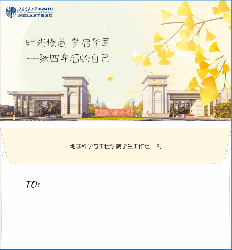请同学们给四年后的自己写一封“信”(内容形式不限,纸张不限,字数不限),可以是对未来的规划,也可以是对四年后毕业时刻想说的话……写完后用特定信封(信封由辅导员老师统一分发,样式如下)装好并标注收件人(个人信息,可以通过趣味的方式标注),由班长统一交至辅导员老师。