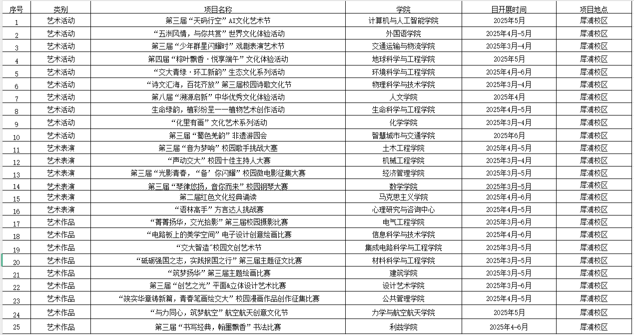 各位同学,最近正值学校第十二届大学生艺术节,有相当丰富的美育活动及比赛,欢迎大家参与!为方便各位同学检索信息,做一个简单的汇总,活动总目录如下: