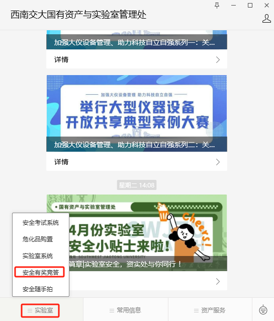 参与答题方式一:扫描二维码关注国有资产与实验室管理处微信公众号,选择“实验室”—“安全有奖竞答”,可多次重复答题直至满分,最后将根据得满分的次数,分等级发放奖品,欢迎同学们踊跃参与!