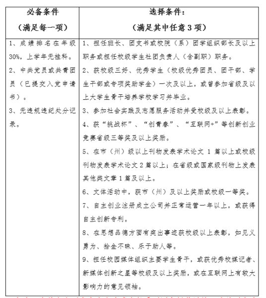 2、在社会实践、志愿服务、社会工作以及思想修养等方面表现突出的校院两级优秀学生干部,原则上为学生组织主要负责人,或下一届主要负责人重点培养对象;