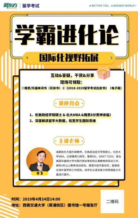 2.本次讲座已开通第二课堂(名称:国际交流与出国留学启蒙讲座),请报名参加的同学提前30分钟到场签到。