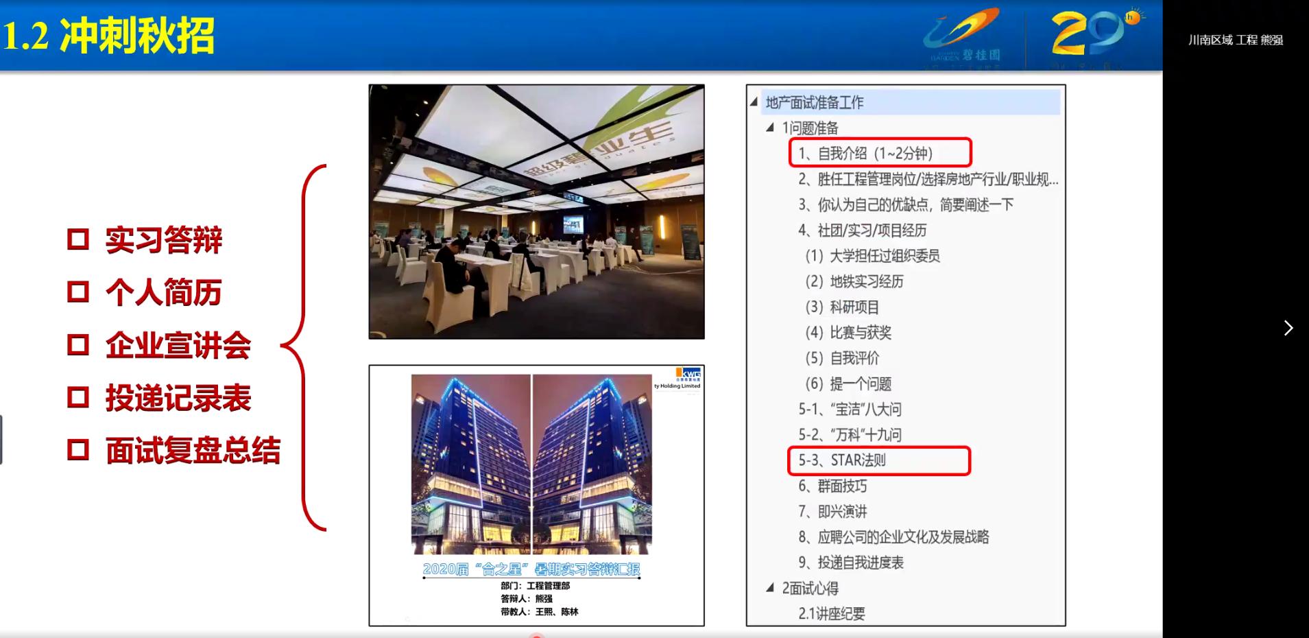 然后,熊强学长着重讲解了毕业生参加招聘会面试的注意事项,传授同学们编辑简历的技巧和面试准备重点。此外,学长建议同学们做一份心理性格调研,认清自己,了解到自己性格适合的工作。之后张鹏学长也向我们讲解了工程岗位的具体工作感受和自己的一些亲身经历,强调实习的重要性。学长们都对同学们未来的就业怀着满心祝福。