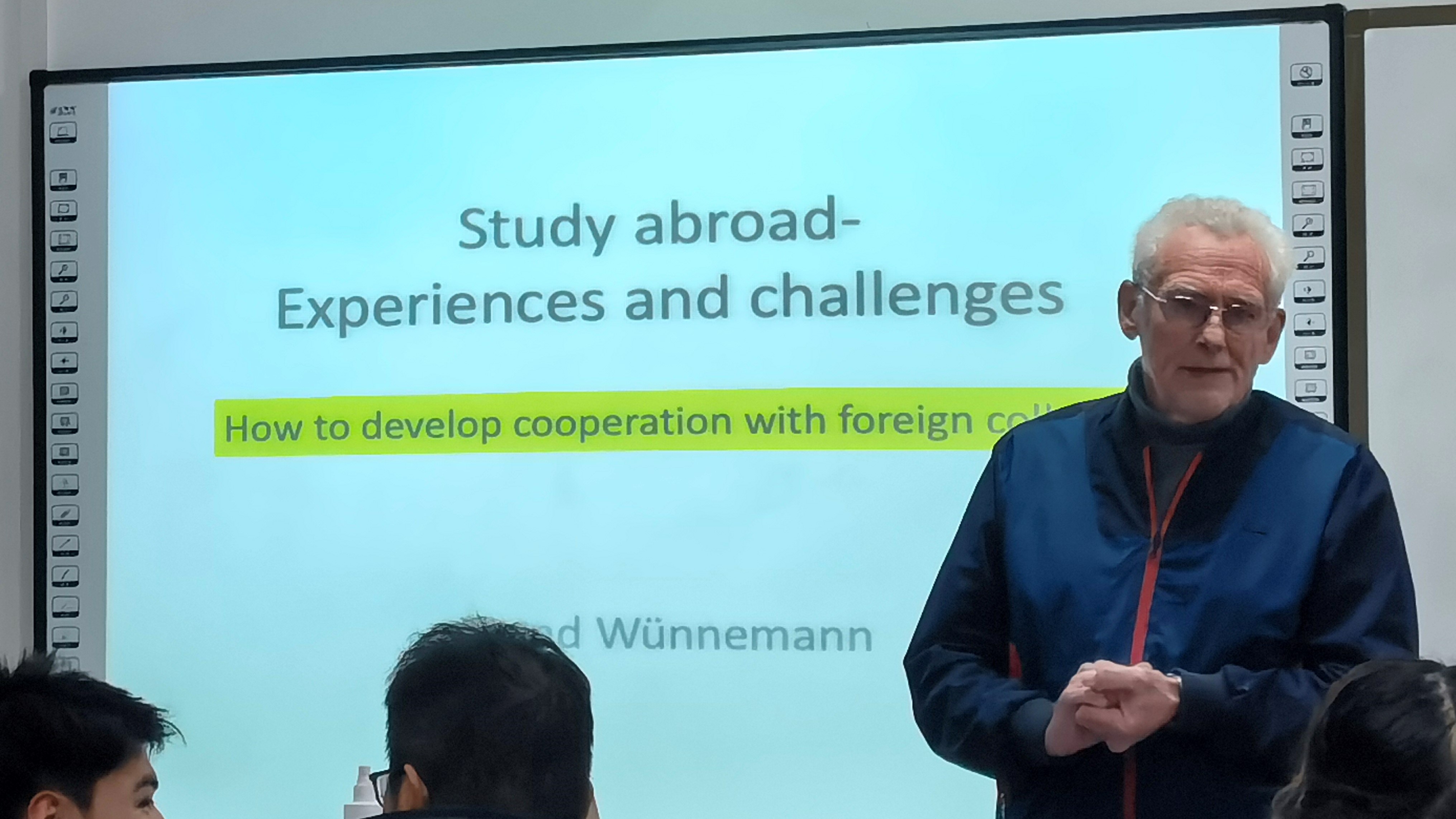 首先,教授介绍了自己在南京大学以及柏林的教学经历,并对本次讲座开展的意义和具体内容进行了说明。教授表示,出国留学是一个充满了机遇与挑战的选择,它能让同学们融入到一个新的文化环境,通过这个机会加强自己的沟通交流能力,发展自身的学术能力,从而提高自己的竞争力与发展前景。