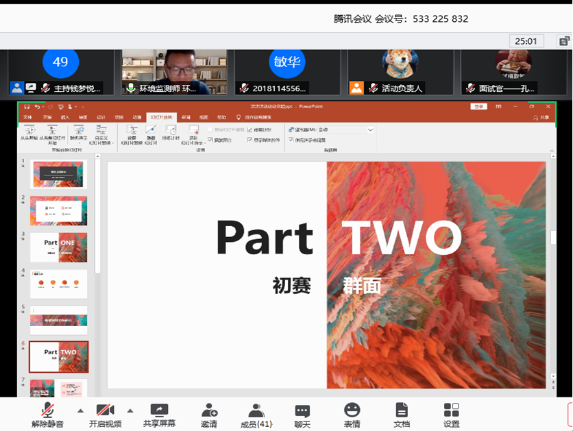 2020年5月8日晚19:30,“模拟线上招聘会”求职大赛迎来最后的重要环节—“模拟面试比赛”,本次比赛通过线上平台“腾讯会议”进行,比赛由钱梦悦、王媛等同学主持,蘑菇视频