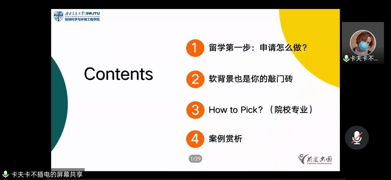 首先,老师对出国留学的流程和规划做了简略的叙述,出国留学并非简单地处理语言和搞好成绩的问题,要细致地做出自己大学四年的时间规划。