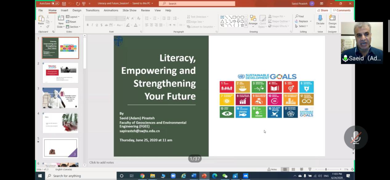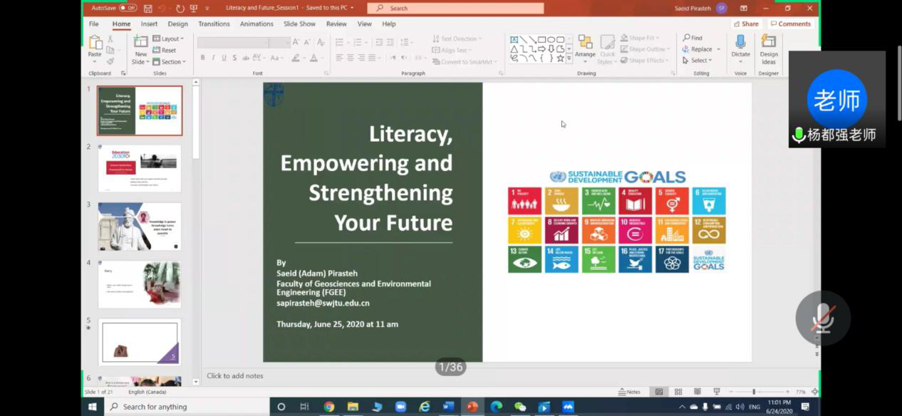 为响应教育部“停课不停学、停课不停教”的号召,助力地学国际化示范学院申建工作,营造国际学习氛围,进一步提升我院深造工作实效,学院就业指导工作中心邀请到Saeid(Adam)Pirasteh(博士,副教授)于6月25日上午11:00通过开展“国际化+名师讲堂”国际视野与出国留学系列讲座第五期,会议由杨都强老师主持。
