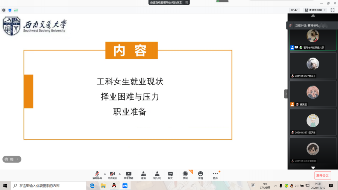 翟琦老师从工科女生就业现状、择业困难与压力、求职准备等方面入手,分析工科女大学生就业形势,并就学生日常学习生活给出建议。