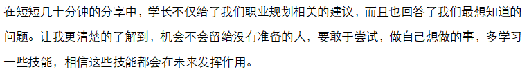 谈及职业规划,学长呼应本次活动的主题“做想做的事情”建议同学们要提前做好职业规划,不要像无头苍蝇没有头绪地去投简历,要根据自己的热爱去选择就业岗位,趁年轻要敢于试错敢于尝试,在不断尝试中选择最适合的岗位。