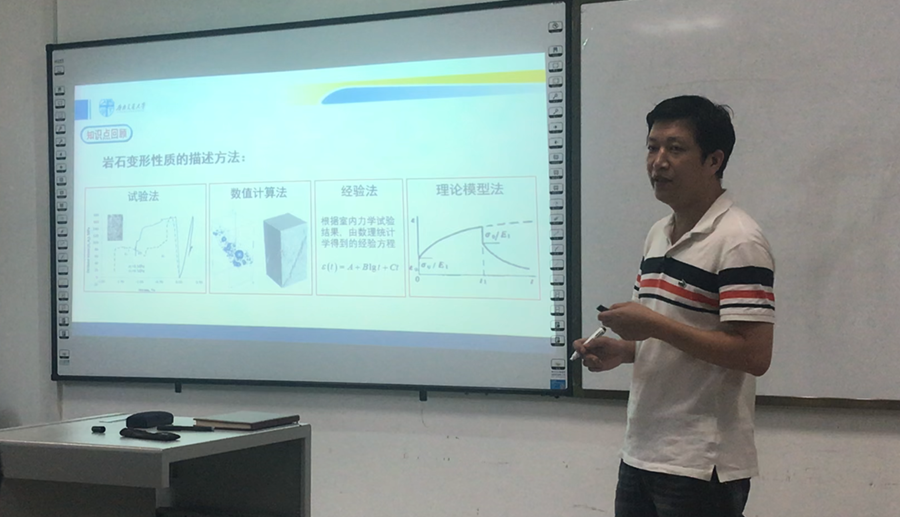 陈仕阔老师主讲岩石的蠕变性质,他从蠕变的定义和典型试验曲线入手,分阶段描述了其力学作用过程,并引入理想物体的基本元件及力学模型,推导了基本组合模型的本构方程,并对其优缺点进行了总结,让学生们结合实际工程推导自己的本构模型。