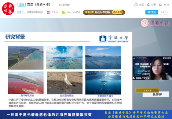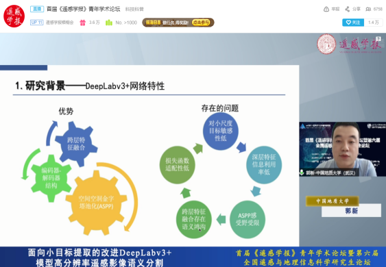 中山大学的陈佩敏同学介绍了城市化在水平、垂直方向上的明显扩张,针对目前缺乏用以表征城市垂直特征的综合数据的现状开展了相关研究。中国地质大学(武汉)的郭新同学,从改进ASPP、优化损失函数、探索注意力机制三个方向进行Deeplabv3+的改进。新疆大学的包青岭同学介绍了干旱区研究背景,并汇报了土地覆盖变化与驱动力分析等研究内容。宁波大学的候婷婷同学提出了一种基于高光谱影像的近海养殖筏提取指数,以实现养殖浮筏的简单、快速、精确提取。蘑菇视频