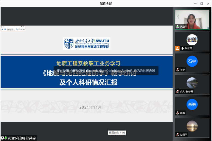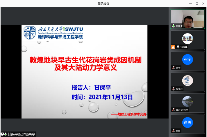 为进一步加强我系青年人才队伍建设,为青年教师搭建更广阔的交流平台,促使学术成果交流,促进青年教师在教学和科研等方面快速成长。地质工程系于11月13日早上9:00-11:30召开了线上业务学习活动,本次活动的主题以青年教师学术交流为主,会议由张志厚老师主持,地质工程系全体教师参加了此次会议。本次会议上,青年教师翟新乐、甘保平和沈亚萍分别作了考虑细粒迁移的饱和多孔介质热弹性模型、敦煌地块早古生代花岗岩类成因机制及其大陆动力学意义和《地质与第四系地质学》教学研讨的报告。报告期间,三位青年教师就各自的专业领域,结合学院特色专业的发展,规划了各自未来的研究方向。