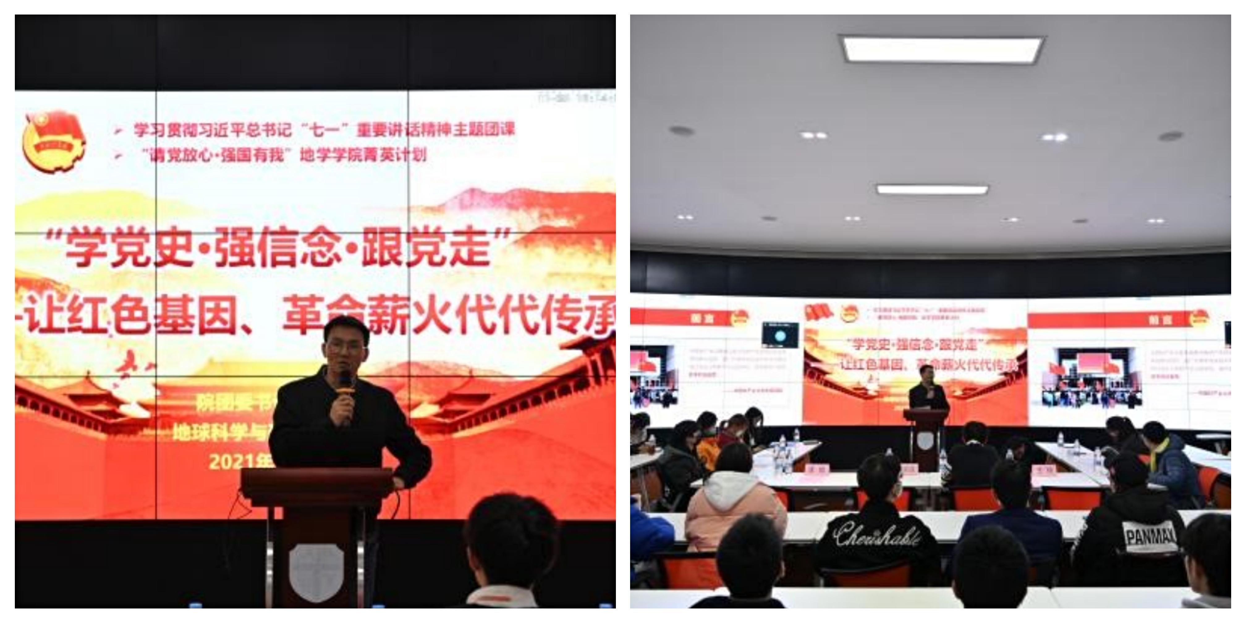 本次仪式的第二项议程,由杨都强老师为同学们带来“学党史、强信念、跟党走”主题团课。