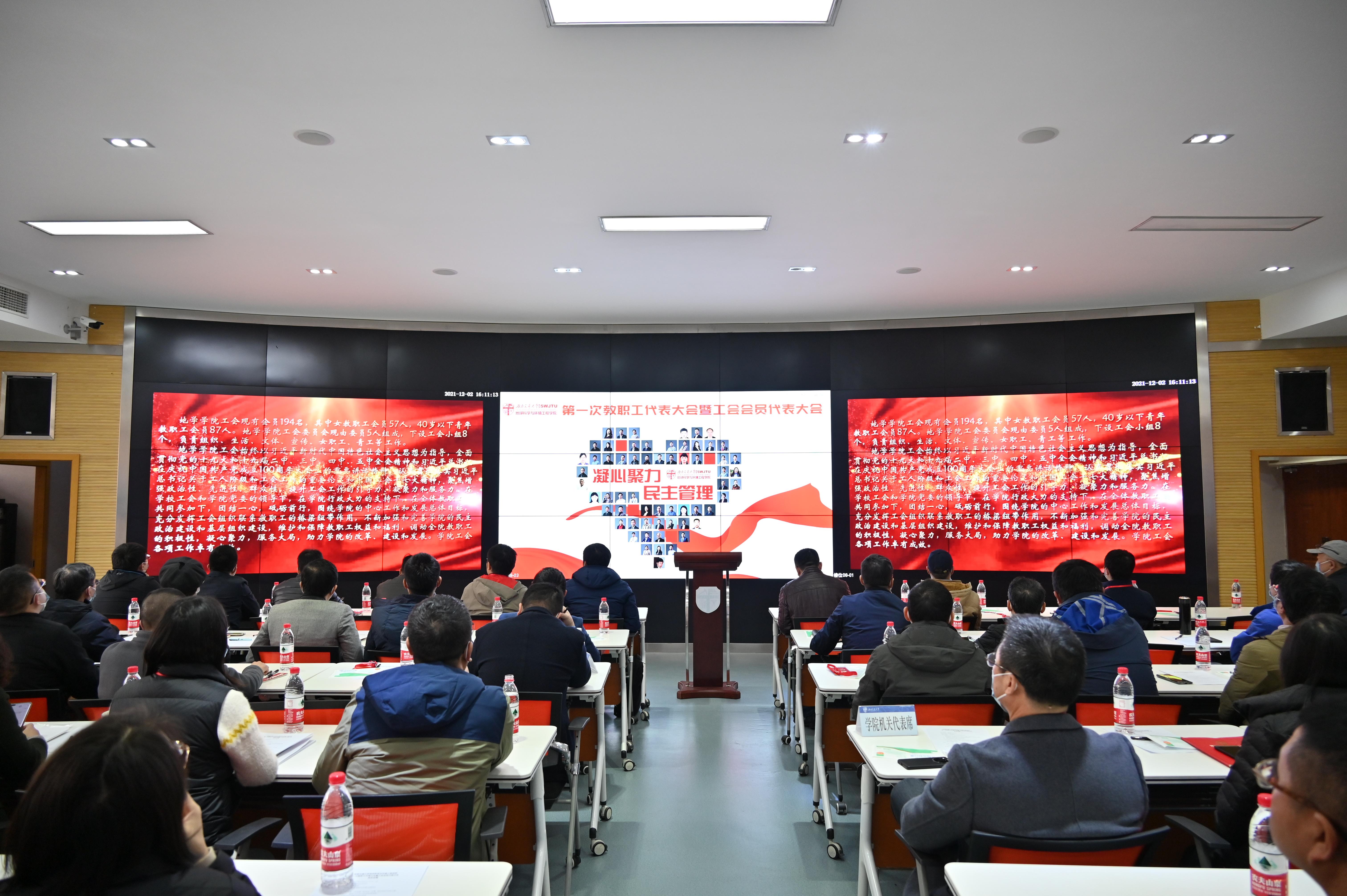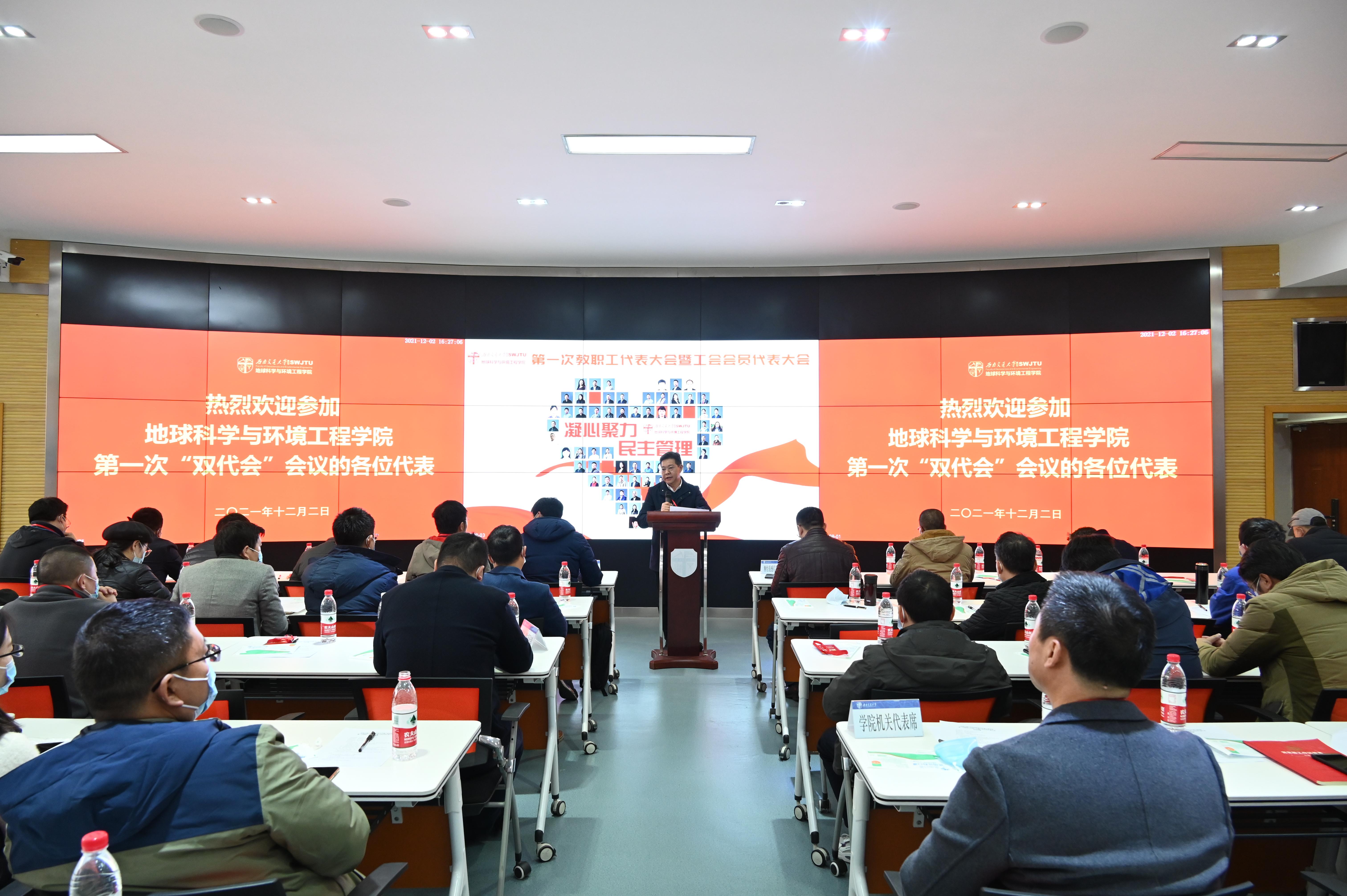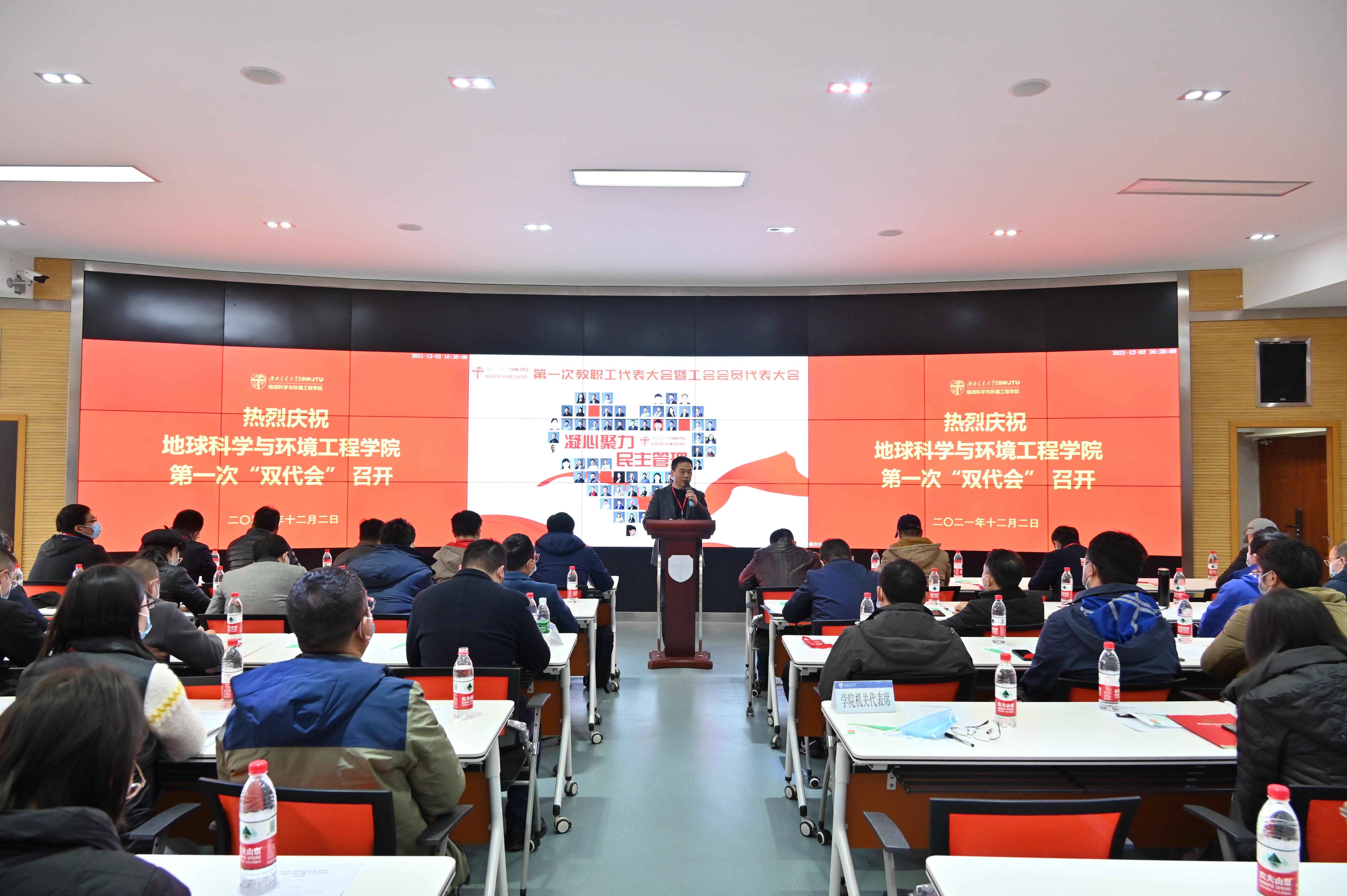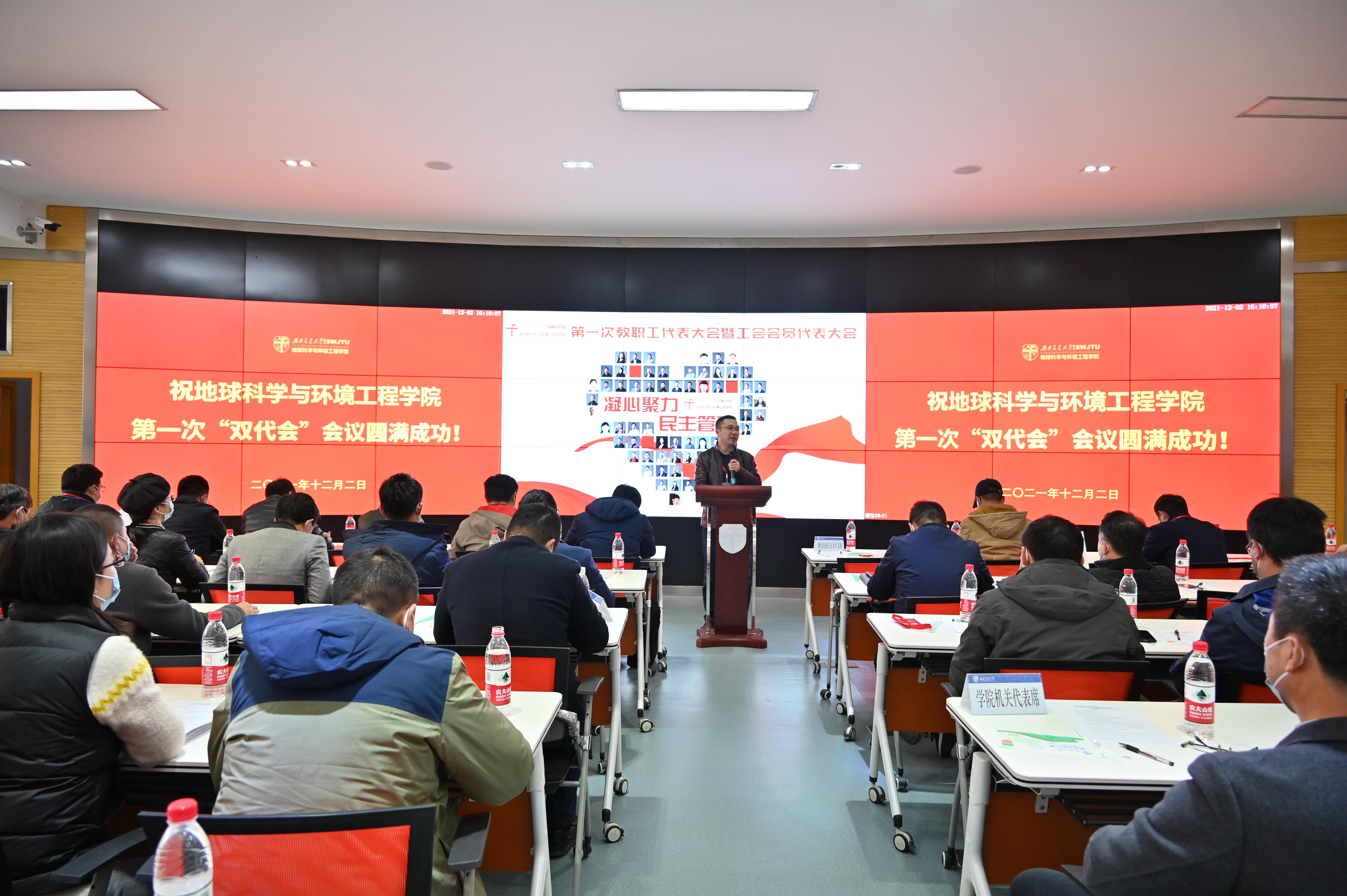 地球科学与环境工程学院第一次教职工代表大会暨工会会员代表大会于2021年12月2日下午4:00在犀浦校区4243召开。此次大会采取线下方式举行,应到代表61人,实到代表55人,本次大会的工作任务是审议学院上一届工会委员会工作报告和工会会费收缴及经费使用情况的报告、选举产生学院新一届工会委员会委员、选举产生学校“双代会”代表。学院党委副书记、纪委书记傅尤刚同志主持本次大会,学院党委书记关秦川同志致辞,学院执行院长刘国祥同志讲话。