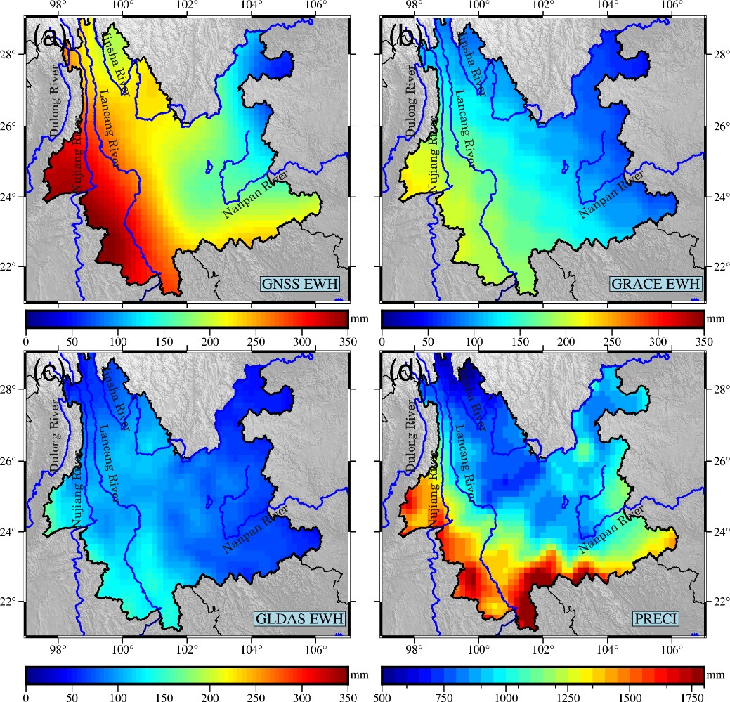 图一 云南地区GNSS、GRACE、GLDAS得到的陆地水储量变化周年振幅以及多年平均年降雨量 (发表于Remote Sensing of Environment)
