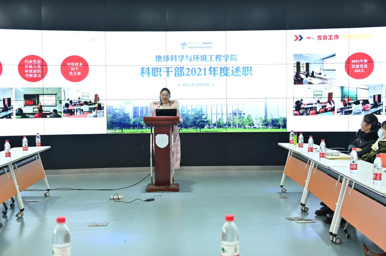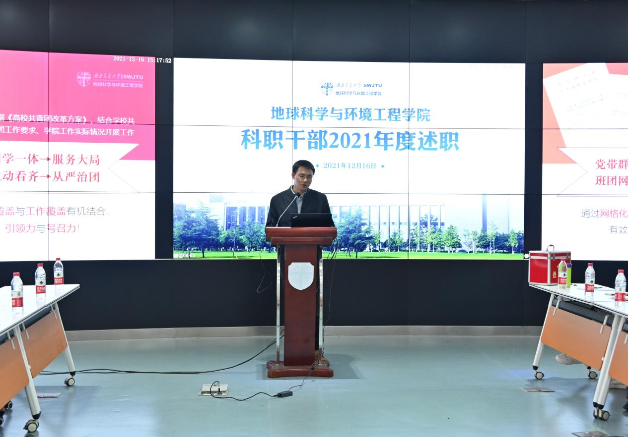 于X4243召开科职干部2021年度述职大会。学院党委书记关秦川,党委副书记、副院长许军华,党委副书记、纪委书记傅尤刚,副院长张玉春,以及机关各部门共同参与此次会议。党务秘书李晓宇、综合事务办主任杜鸿、综合事务办(国际化方向)主任关方、教育教学办主任闫玲、学科学术办主任周青、学生工作办主任杨都强等6名老师进行现场述职。