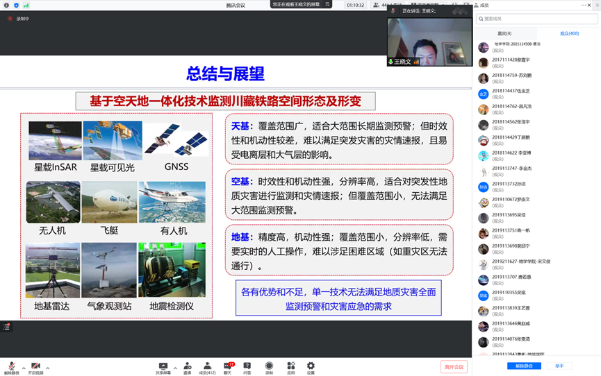 在讲座的最后,王晓文对本期内容进行了总结和展望,提出了未来将基于空天地一体化技术手段监测川藏铁路的空间形态及形变,同时鼓励地学青年学生也参与到我国遥感科学的工作当中,勇于创新,学习先进的科学技术,投身于我国的铁路建设当中,用青春的热血去建设我们美丽的国家。