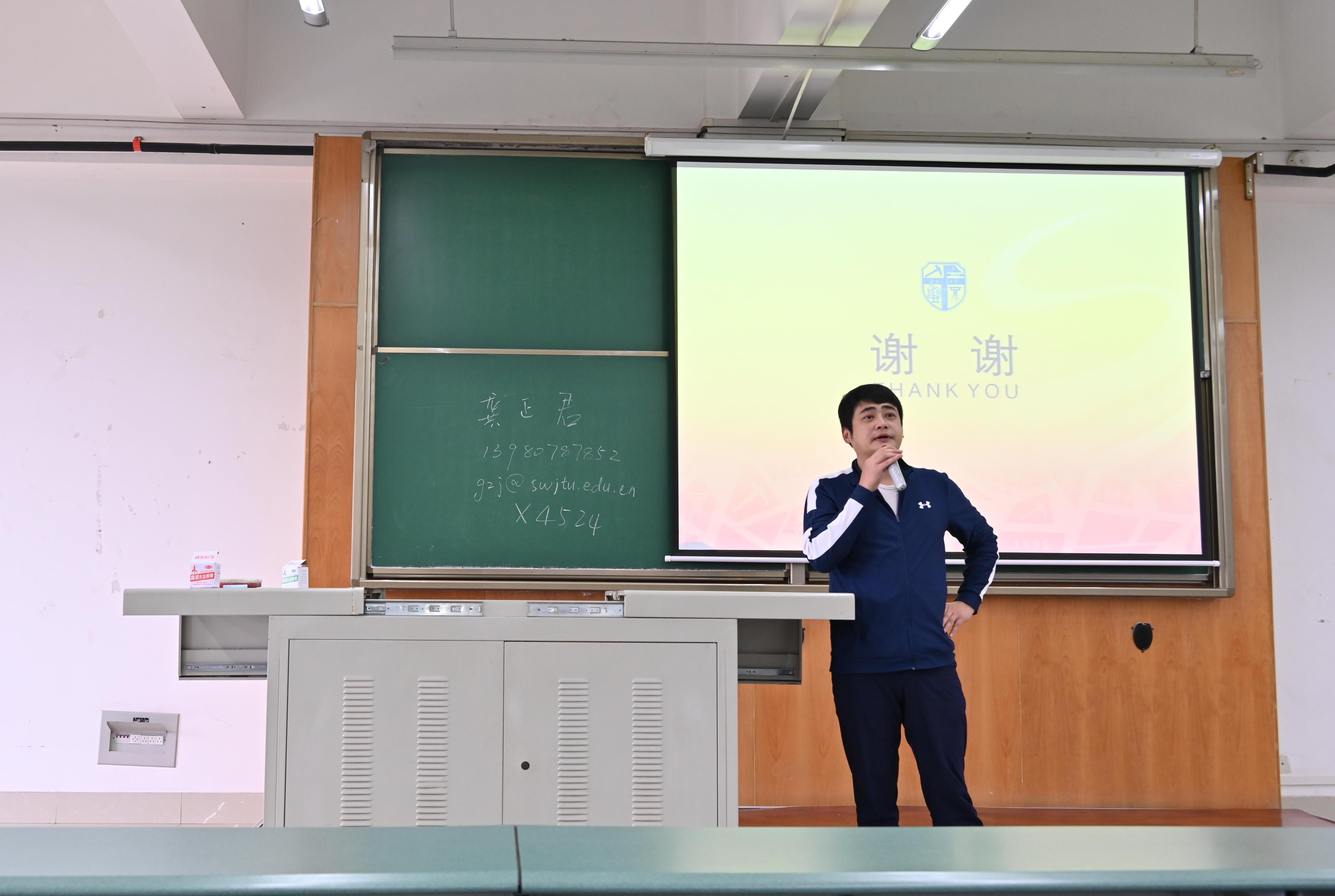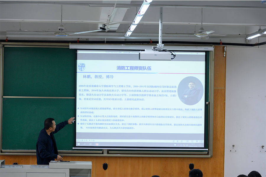 第二个环节由消防工程系老师主要讲述,李涛老师主持。李涛从全球火灾、消防事故等方面引入消防专业介绍,为同学们讲解了学科专业开设历史、全国开设消防工程专业高校、学校消防工程系发展,以及专业管理服务团队。他对学院人才培养体系、专业培养目标、专业领域进行详细说明,向同学们展示了学院消防实验中心的建设,详细说明了消防专业的国际化交流以及消防工程的就业前景。他强调,火灾安全是国家公共安全的重要组成部分,随着社会时代的发展,消防专业的优势也愈发显著,鼓励同学们积极选择消防专业。