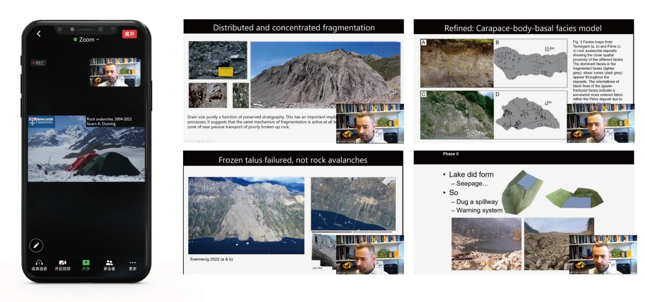 其后Dunning教授简要介绍了冰川地区的高速远程滑坡(supraglacial rock avalanche)这一近年来随着全球气候变暖、极端气候频现而逐渐高发的滑坡灾害,并再次强调了滑坡沉积学特征对重建滑坡流变模型,分析滑坡启动机制的必要性。