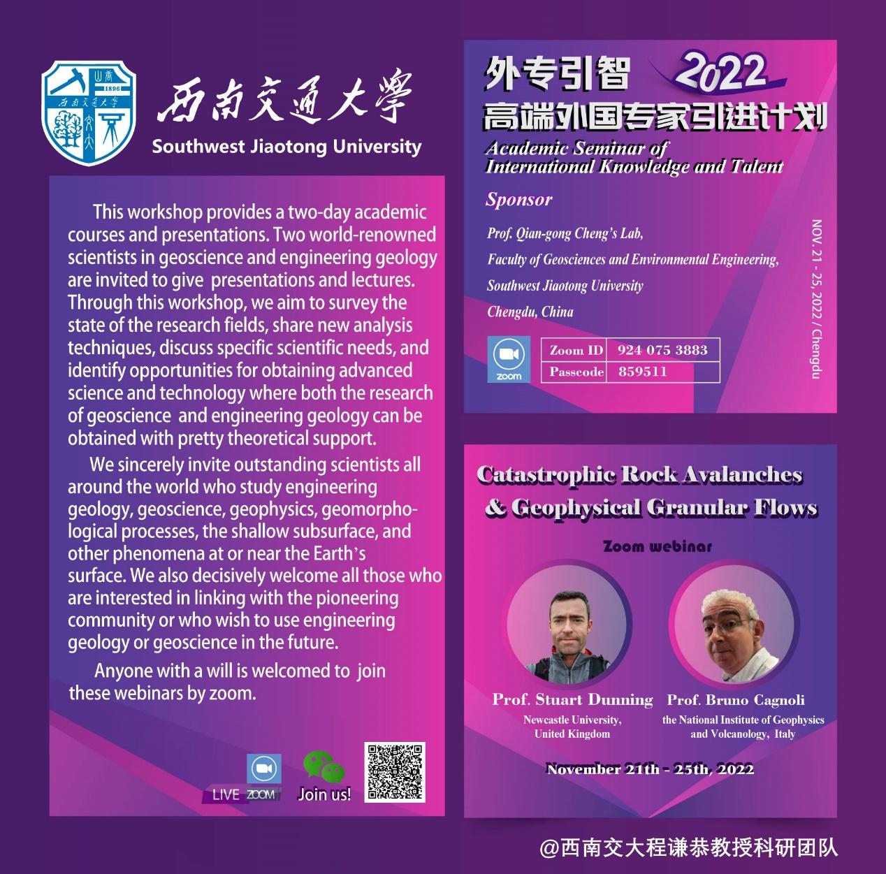 地球科学与环境工程学院程谦恭教授主持的2022年度“外专引智-高端外国专家引进计划”学术活动顺利举办。来自国际知名高校及科研机构的杰出科学家Stuart Dunning和Bruno Cagnoli分别围绕高速远程滑坡沉积学特征与颗粒流动力学特性研究,呈现了精彩的学术报告。本次活动以网络视频会议方式开展。参会人员认真听取学习了2位专家的学术报告,并在会后积极与专家交流,受益匪浅。