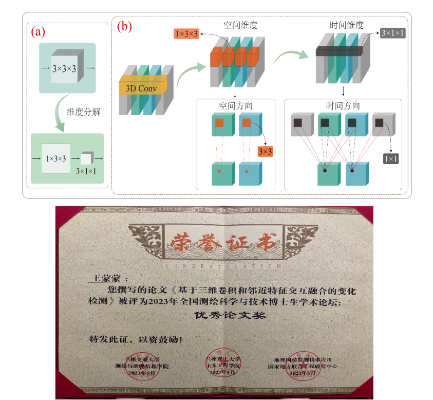 叶沅鑫老师指导的2020级博士生王蒙蒙撰写的论文“王蒙蒙,叶沅鑫,周亮,雷光阳. 基于三维卷积和邻近特征交互融合的变化检测”荣获大会优秀论文奖。该论文提出一种将双时相影像看作视频处理中的前后帧,提出一种新的融合策略,即引入三维卷积对双时相影像进行特征提取和融合,为了降低三维卷积的参数量,进一步将三维卷积分解为空间维度上的二维卷积和时间维度上的一维卷积。此外,设计了一种邻近特征交互融合模块以减小全尺度特征间的信息差异。该方法能够利用三维卷积内部融合性质有效克服双时相影像特征提取和融合不充分的问题,实现了更高的变化检测精度。