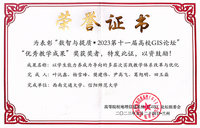 地球科学与环境工程学院青年教师团队的教学成果“以学生能力养成为导向的多层次实践教学体系改革与优化”项目获得全国高校GIS优秀教学成果奖。该项目由朱庆教授指导,叶沅鑫,杨雪峰,樊建伟,尹高飞,葛旭明,田玉淼为项目参与人员,建立了以培养学生能力为导向的多层次实践教学体系,提出了以科研项目为驱动的产学研人才培养新模式,推动了高校与科研院所、企事业单位共建实践教学平台,形成了创新实践的人才培养体系,培养了一大批优秀学生。