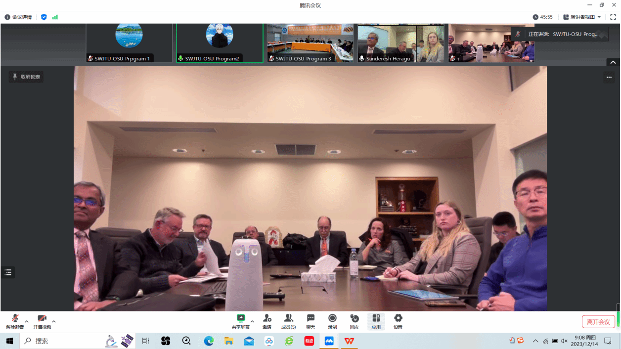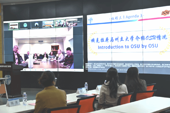 副校长姚发明、俄克拉荷马州立大学副教务长兼全球研究与合作学院院长Randy Kluver出席了会议,会议由俄克拉荷马州立大学工程建筑与技术学院副院长Sunderesh Heragu主持。
