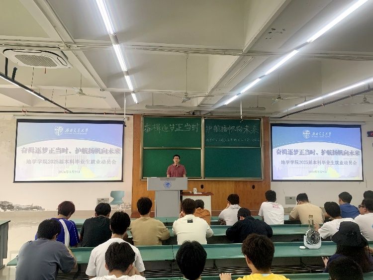 党委副书记郑波主讲,学院团委书记、就业工作负责人杨都强老师主持,本科2021级辅导员梁爽、王琼、胡佳慧、李林遥及学院2025届全体本科生参加。