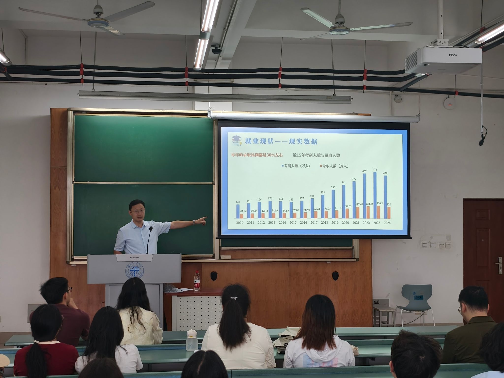 党委副书记郑波主讲,学院团委书记、就业工作负责人杨都强,本科2020级辅导员杨冰倩及2024届本科生60余人参加。