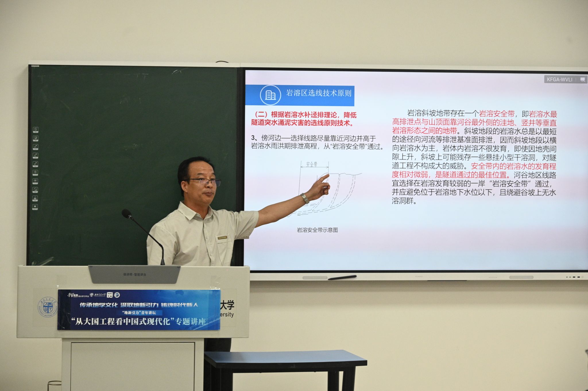 在四号教学楼X4247教室隆重举办了“从大国工程看中国式现代化”专题五讲座。本次讲座聚焦岩溶区铁路综合选线技术,邀请了业内知名专家中铁二院教授级高工曹化平作为主讲人,讲座由蘑菇视频