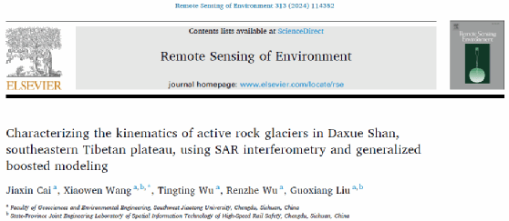 论文详细信息:Cai Jiaxin, Wang Xiaowen*, Wu Tinging, Wu Renzhe, Liu Guoxiang. Characterizing the kinematics of active rock glaciers in Daxue Shan, southeastern Tibetan plateau, using SAR interferometry and generalized boosted modeling. Remote Sensing of Environment, 2024, 313: 114352.
