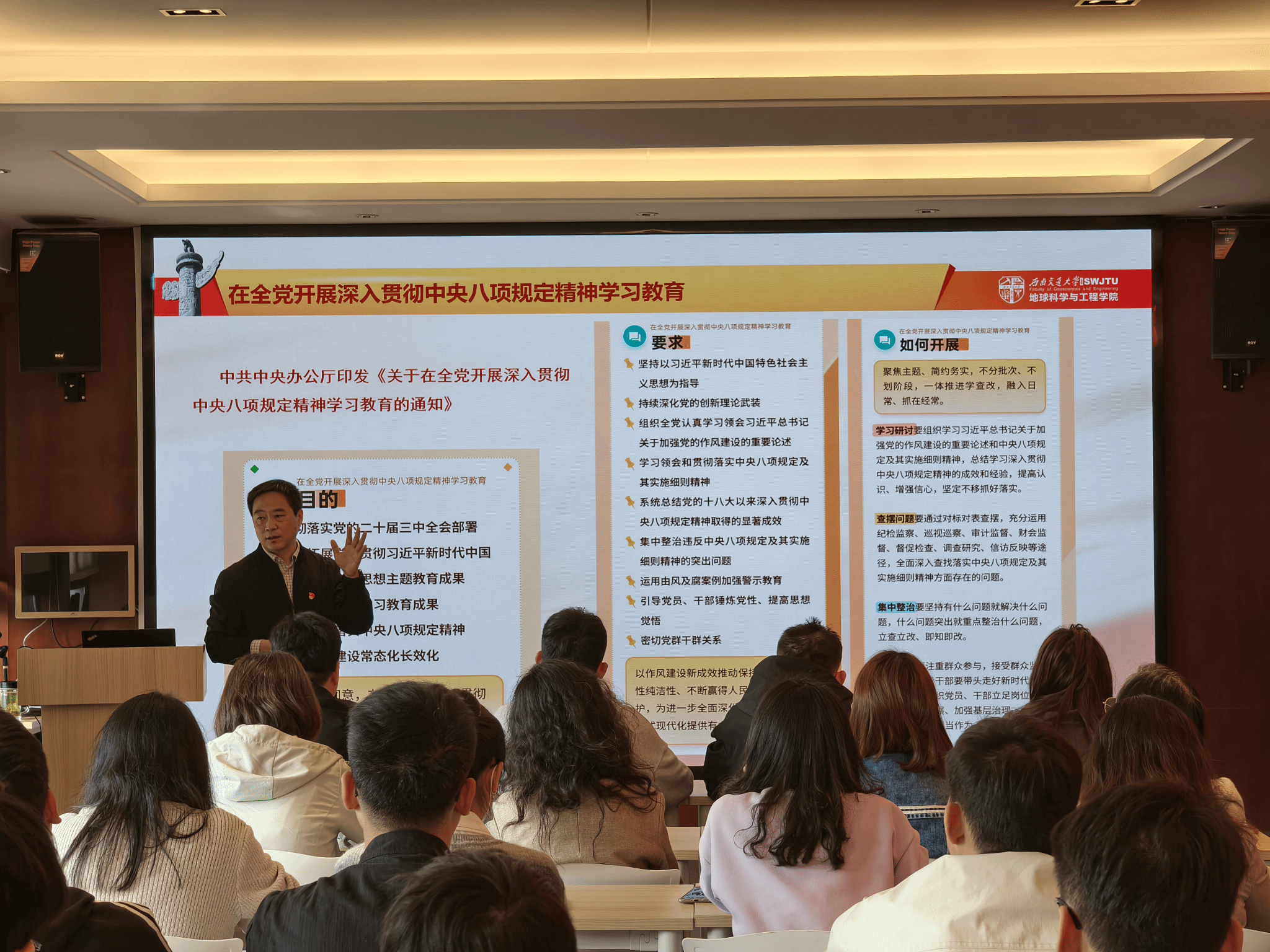关秦川书记以“徙木立信、久久为功、化风为俗”为标题,从商鞅变法引申出取信于民、推动作风建设的核心理念,带领大家学习中央八项规定精神。关书记首先详细阐述了中央八项规定精神的目的、要求及如何开展等内容,然后从历史与现实层面,通过生动的案例和具体的数据,强调了推进作风建设常态化和长效化、巩固深化党纪学习教育成果、让“久久为功、化风为俗”成为习惯的必要性与重要性。关书记深入剖析了在两个百年历史交汇的时代背景下,中央八项规定精神在推动党风政风建设、促进社会发展方面所发挥的积极作用。关秦川书记指出,要充分理解中央八项规定与中央八项规定精神的区别,在学习中知敬畏,敢于斗争、勇于斗争,不断提升自我修养和工作作风,成为一个有道德、脱离低级趣味、有益人民的人。